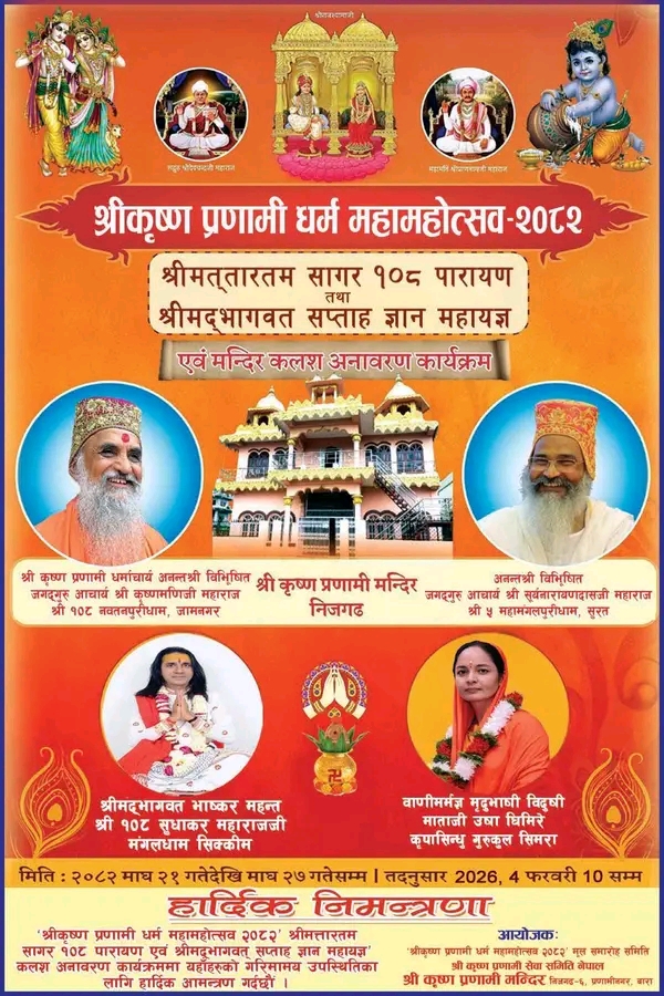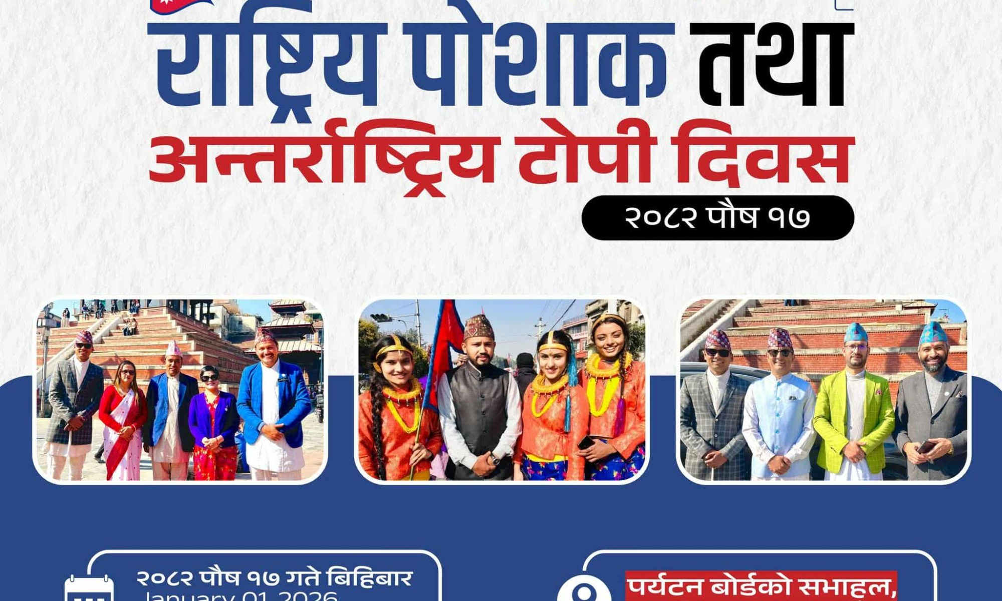 राष्ट्रिय धरोहर संरक्षण प्रतिष्ठान नेपालको आयोजनामा कार्यक्रम २०८२ साल पौष १७ गते बिहीबार (January 01, 2026) काठमाडौँको भृकुटीमण्डपस्थित पर्यटन बोर्डको सभाहलमा बिहान ११ बजेदेखि दिउँसो ३ बजेसम्म सञ्चालन हुनेछ।
