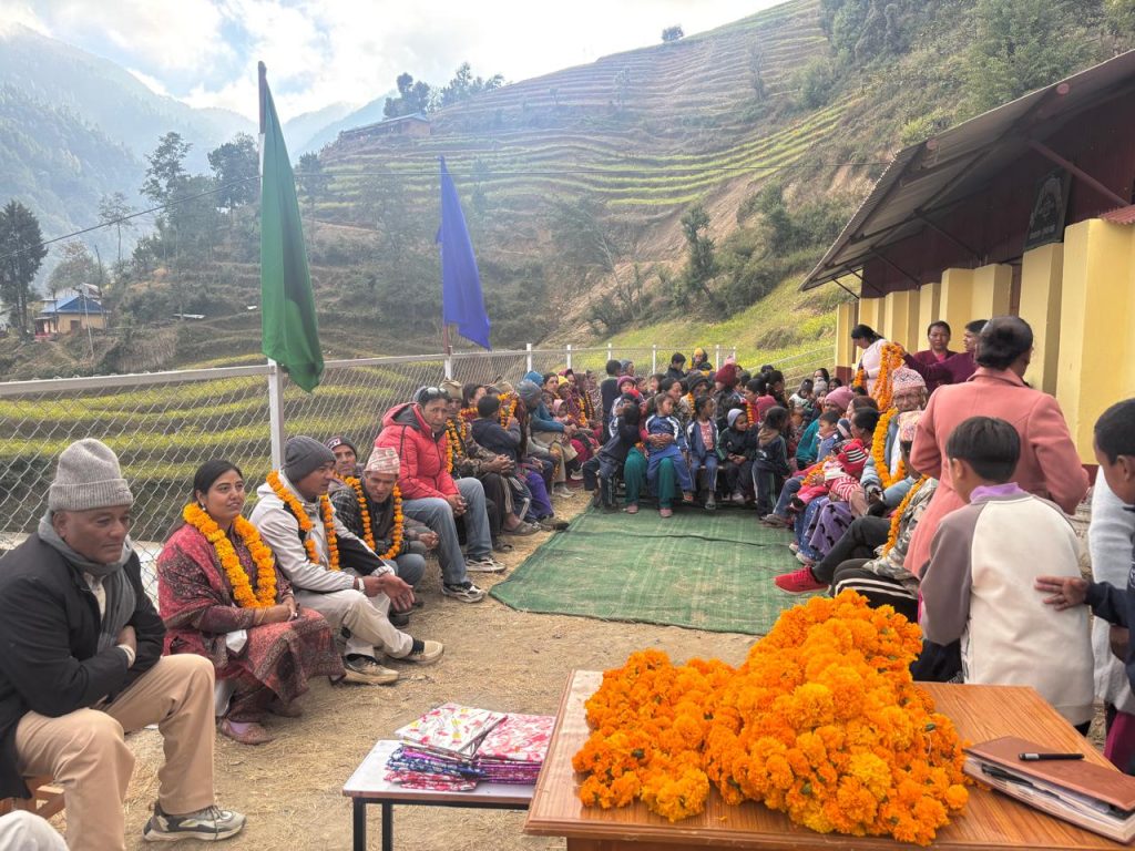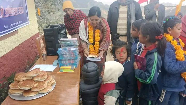 समाजसेवी मिना घिमिरेले गत वर्षमा विद्यार्थीहरूलाई न्यानो कपडा वितरण गर्नुभएको थियो भने यसपाली स्टेशनरी र खाजा वितरण गर्नुभयो।