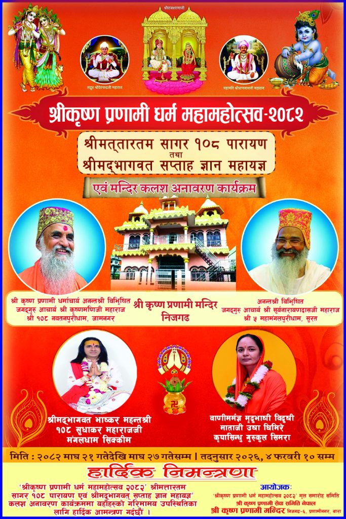 बारा / वैदिक सनातन धर्मको विकास तथा आध्यात्मिक चेतनाको अभिवृद्धि गर्ने उद्देश्यका साथ ‘श्रीकृष्ण प्रणामी धर्म महामहोत्सव–२०८२’ निजगढमा आयोजना हुने भएको छ।